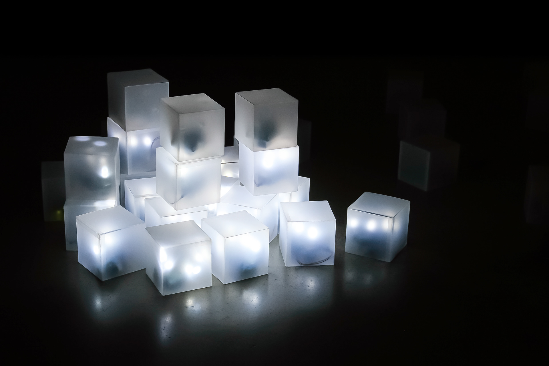 Light Box is an interactive installation that utilizes lights, Arduinos, and photo-sensors to engage users in collaborative play. With the shape and scale of a children’s building block, but the aesthetic of a contemporary lamp, Light Box encourages both children and adults to create unique forms and structures with the toy-like objects.